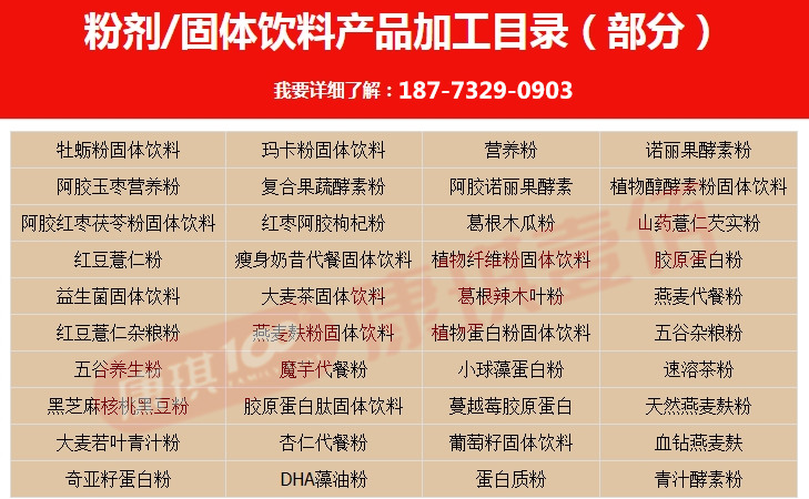 湖南康琪壹佰生物科技有限公司是一家从事各种食品加工生产的企业,主要提供固体饮料、压片糖果、软胶囊、口服液、袋泡茶等产品的加工生产研发业务,为客户提供各种配方调试、小样试制、产品生产等服务。康琪壹佰现面向国内及东南亚地区客户提供虾大麦若叶青汁代加工业务,主要原料为大麦叶粉、青汁提取物,可制成风味饮品或其他的产品以配料的形势添加,多种灵活的oem服务,其他健康代餐粉及口味代餐粉代加工oem业务欢迎咨询湖南康琪壹佰生物产品代加工合作,我们将竭诚为你您服务!
